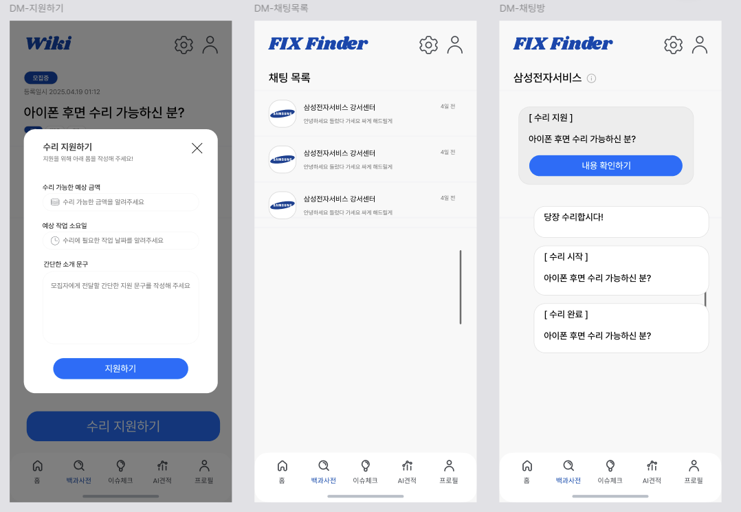 먼저 간략한 서비스 소개를 하자면 사설 수리업체와 수리가 필요한 유저를 매칭해주는 플랫폼이다. 다양한 기능이 있지만 내가 맡은 부분은 유저가 수리 요청 게시글을 작성하면 수리업체가 지원하고 유저와의 챗팅을 통해 수리 예약을 잡는 것이다. 게시글의 상태가 바뀜에 따라 자동으로 상태 변경 메시지가 수신되어야한다