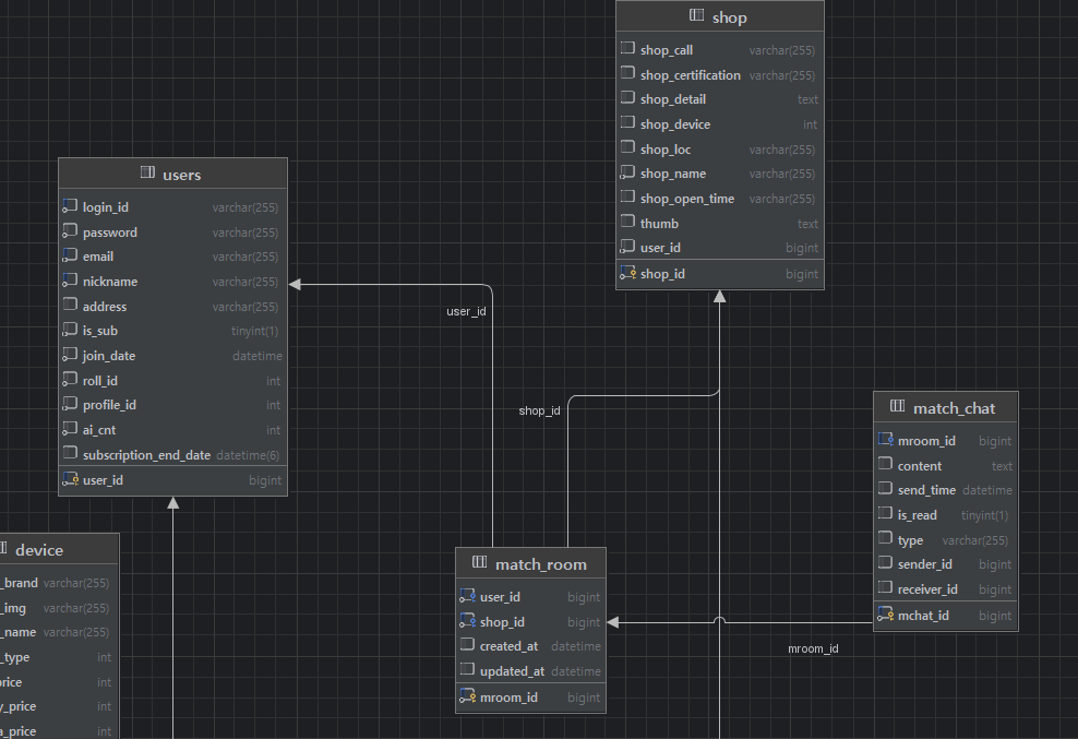 이때 가장 고민했던 부분은 match_room 테이블에 유저 ID를 2개 넣는 방식으로 갈지 아니면 유저 ID 1개와 shop ID를 넣는 방식으로 구성할지에 대한 선택이었다.