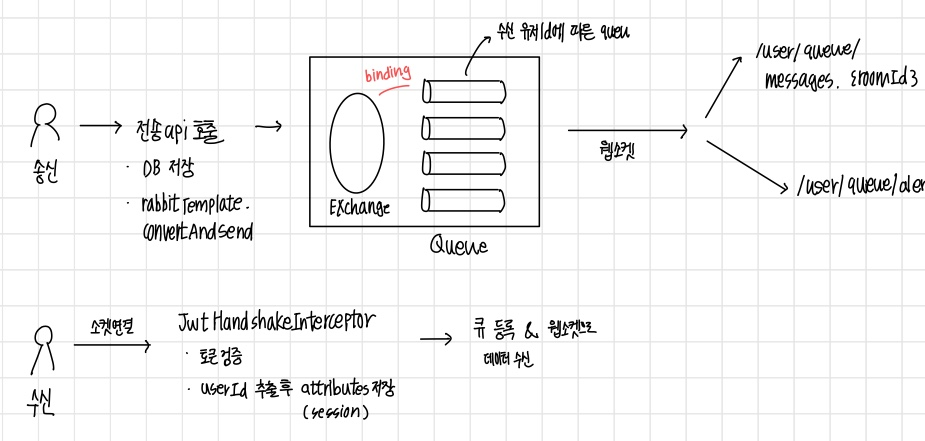 클라이언트가 전송 api를 호출하면 비동기로 chat.user.{receiverId} 큐로 들어간다. 이때 메시지가 큐에 도달하면 websocket을 사용하여 실시간으로 메시지 전송 및 알림을 푸시한다.