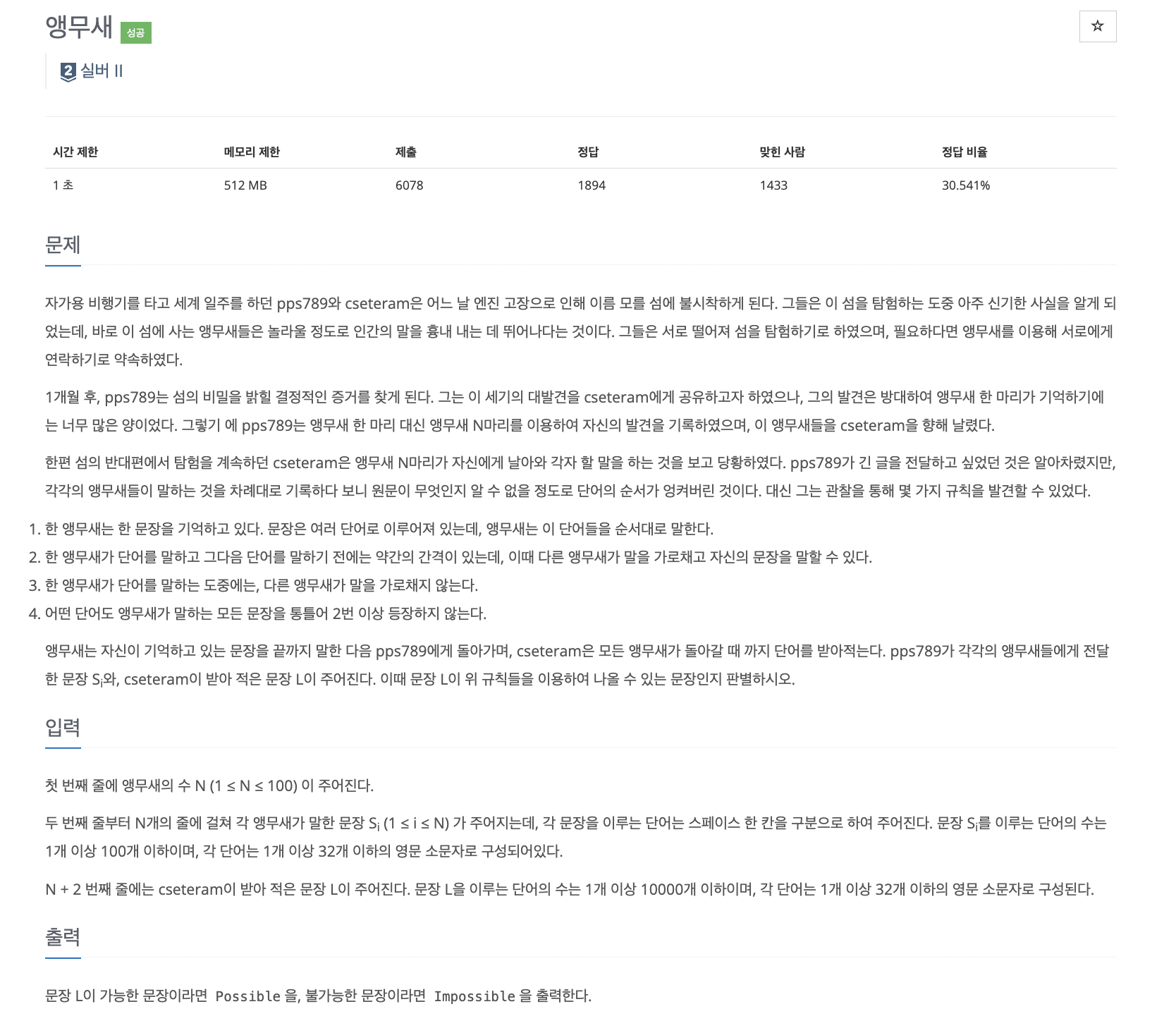 앵무새 여러 마리가 한 문장씩 말하는데 이때 단어를 순서대로 조합해서 마지막에 입력된 문장을 만들 수 있는지 판별하는 문제