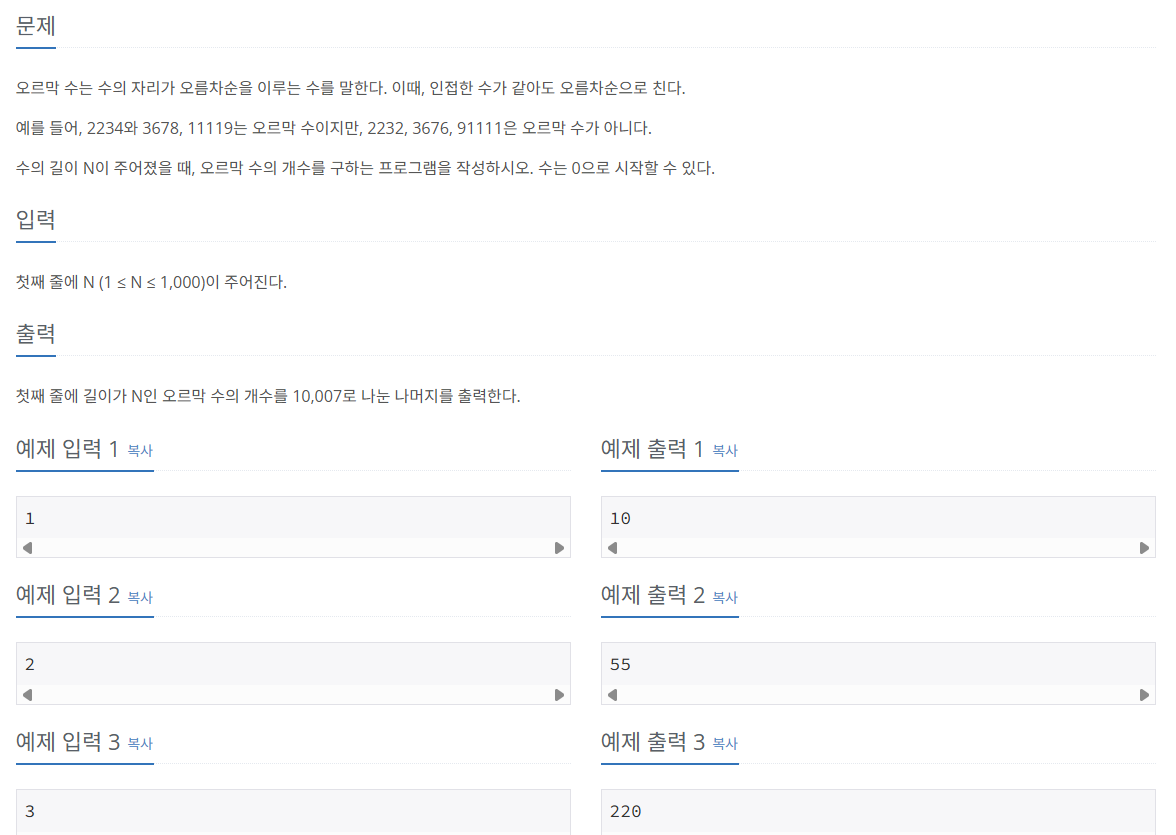 오르막 수의 개수를 구하는 가장 쉬운 방법은 그 수를 하나하나 체크하는 것이다 그러나 하나하나 체크하려면 10^n개의 수의 n자리 수를 확인해야한다 시간초과 걸리기 딱 좋음!!