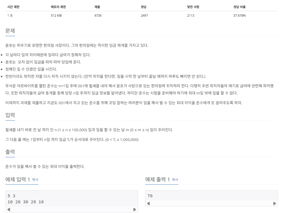 이 문제에서 구해야하는건 길이가 n인 배열에서 연속된 m개의 수의 합이 최대가 되는 것을 구하는 것