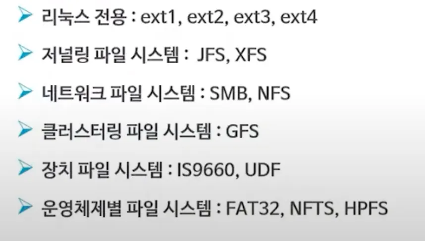 파일 시스템: 디스크의 파티션에 파일을 사용할 수 있도록 구성하는 방식 → 규칙, 구조