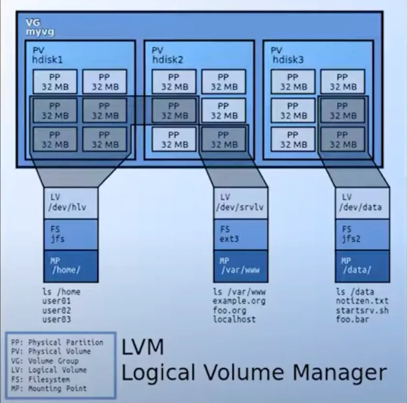 LVM: 다수의 물리적인 하드디스크를 논리적으로 통합하여 하나의 파일 시스템으로 구성하여 사용하는 방식