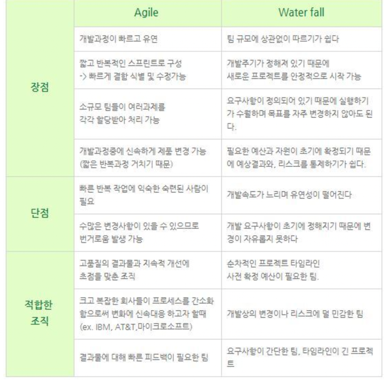 - (수정사항을 반영하여 처음부터 진행), 사용자 피드백에 대한 빠른 대응 어려움, 각 단계가 종결되어야 다음 단계 진행 가능